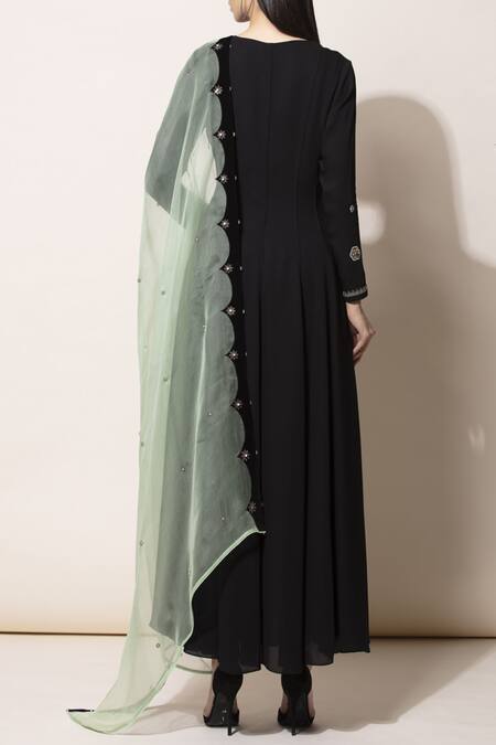 Black plain full sleeve anarkali. Comes with dhoti pants & green dupatta.