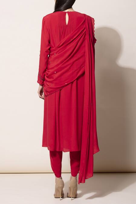 Red anarkali with placement embroidery. Comes with dhoti pants & pre draped dupatta.