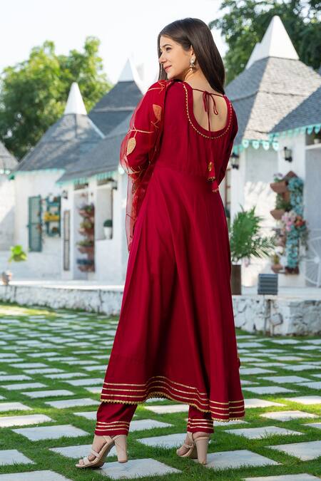 Maroon anarkali in rayon base with lace trims & back scoop neck with tassel tie-ups. Paired with pant & leaf motif embroidered dupatta.