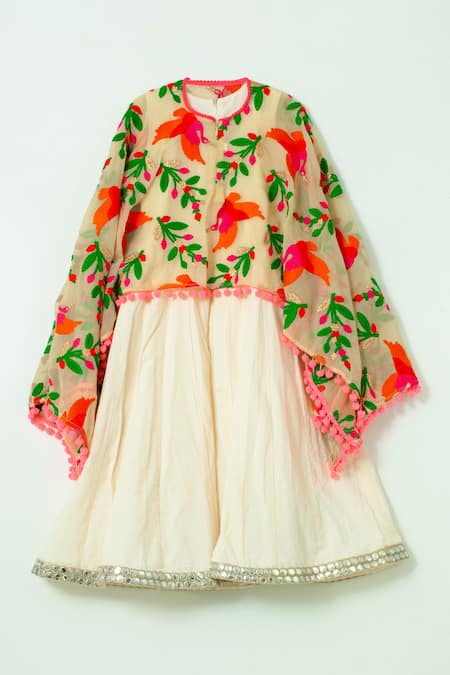 Off-white anarkali featuring a round neckline and flared sleeves. Paired with a cape adorned with bird, mirror, thread, and zari embroidery along with a pom pom border.