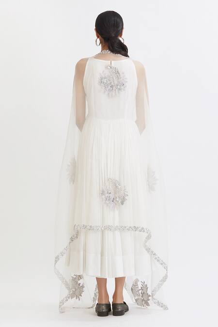 Ivory anarkali with flared silhouette & gathers. Paired with organza dupatta featuring hand embroidered floral & bird motifs.