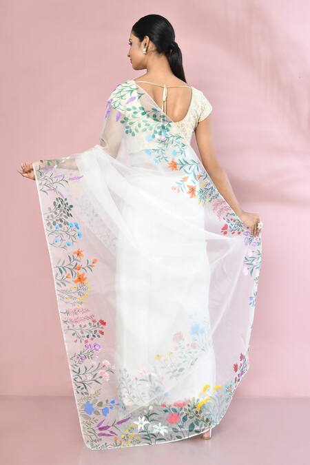 Buy_Anaya By Akruthi_White Organza Hand Painted Floral Saree_Online_at_Aza_Fashions
