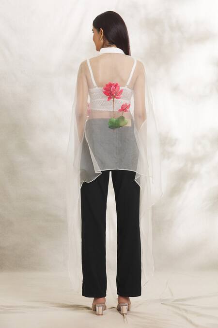 White organza shirt featuring lotus hand-painted placement motifs and batwing sleeves. Paired with a coordinating inner top.