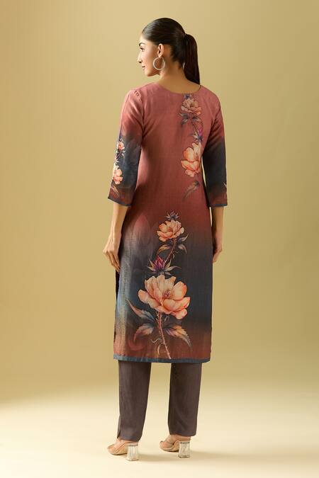 Peach Viscose, Silk, Cotton Embroidery Floral Print Kurta Set With Dupatta