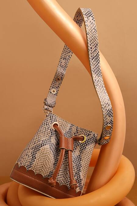 Multicolor bucket bag with python print & scallop cutwork pattern on edges. Comes with a long strap & top handle.