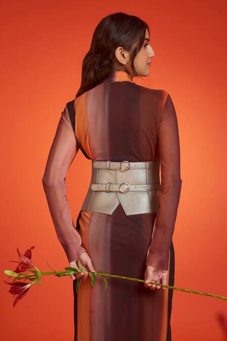 Shiny silver avant-garde corset belt constructed with back gold finish buckles.