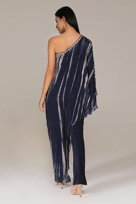 Blue jumpsuit with bootleg comes with hand tie dye flat chiffon drape embroidered with crystal stones.
