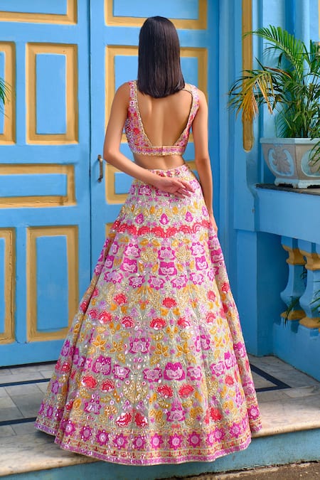 Mint green organza lehenga with floral applique all-over, embellished with mirror and gota. Paired with plunging neck blouse and cutwork dupatta.