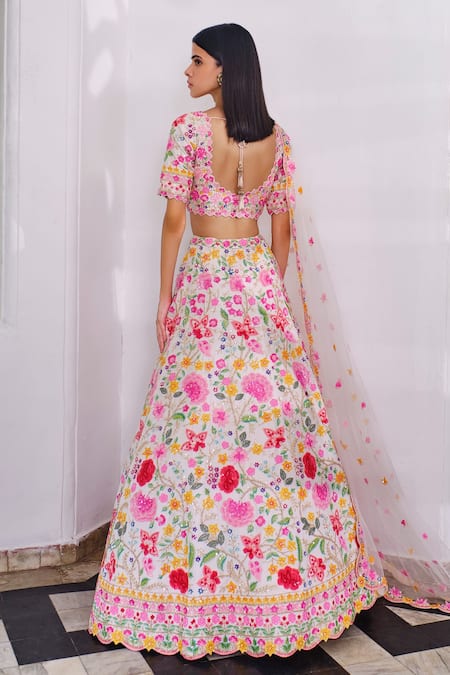 Ivory lehenga with multicolor hand embroidered flowers, embellished with beads, cutdana and sequins. Paired with an embroidered blouse and scallop net dupatta.