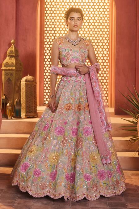 Cream lehenga featuring floral embroidery and scalloped hem. Paired with a padded blouse and an attached net dupatta.