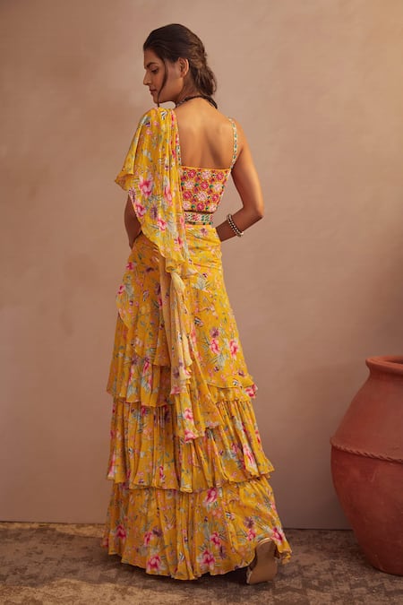 Yellow pre-draped saree with floral printed motifs and tiered ruffle hem. Comes with embroidered blouse and belt.