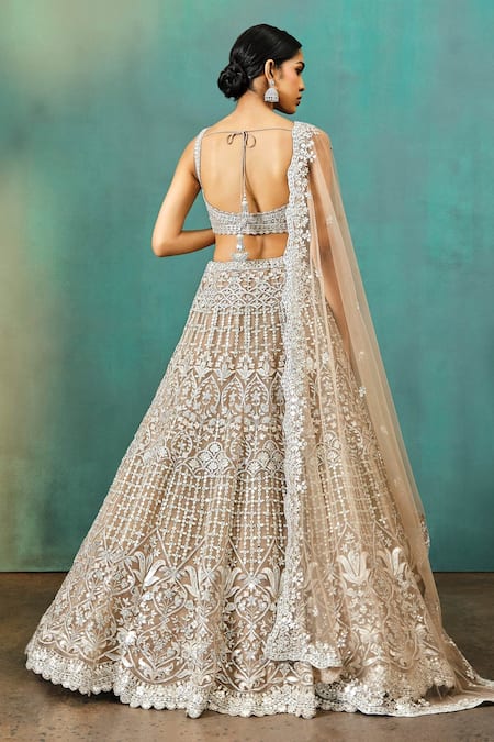 Beige lehenga featuring floral motifs with zari, dori, thread, mirror, and geometric embroidery. Paired with a padded blouse and a scallop bordered sheer dupatta.