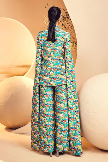 Green Crepe Embroidery Lake Forest Print Cape Sleeve Blazer And Pant Set