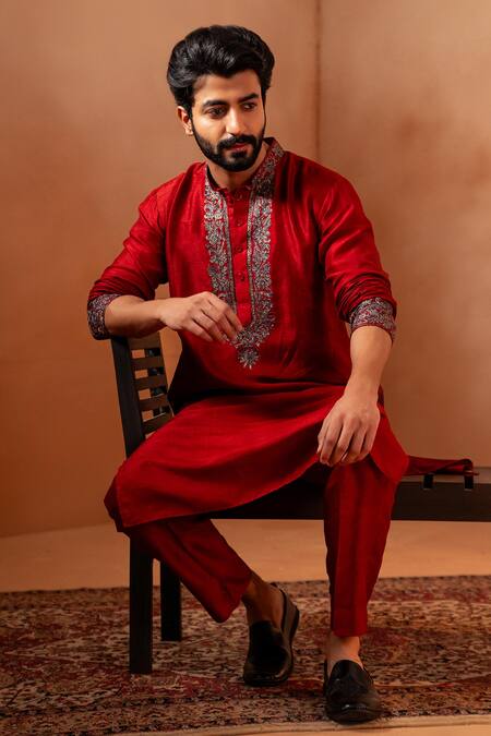 Crimson red kurta featuring a mandarin collar and full sleeves with tilla metallic thread embroidered floral vine motifs on the borders. Paired with matching pants, this set is made from viscose raw silk and includes attached lining.