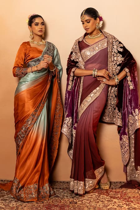 Green and rust orange ombre saree featuring metallic thread and tilla embroidered floral borders. Paired with a matching embroidered blouse and shawl.