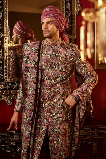Wine Silk, Velvet Sequins, Cut Paisley Majesty Tilla Embroidered Sherwani Set