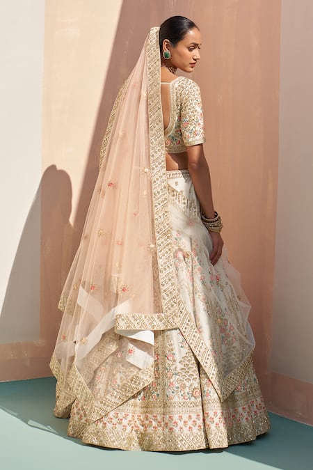 Ivory lehenga featuring intricate zardozi, silk thread, dabka, cutdana, and sequin embroidery. Paired with a matching blouse and two sheer embroidered dupattas.