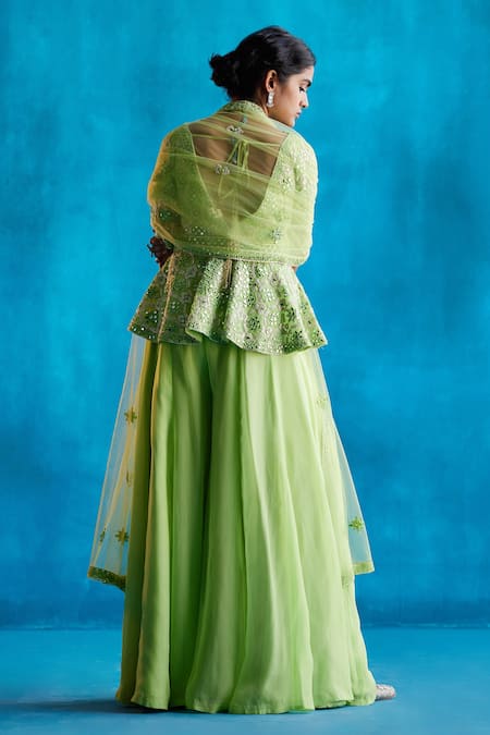 Lime green peplum style top with all-over mirror, thread embroidery and gota patti trims. Comes with sharara and net dupatta.