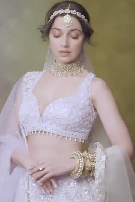 Light pink lehenga, featuring floral pattern embroidery. Comes with plunged neck embroidered blouse and two dupattas.