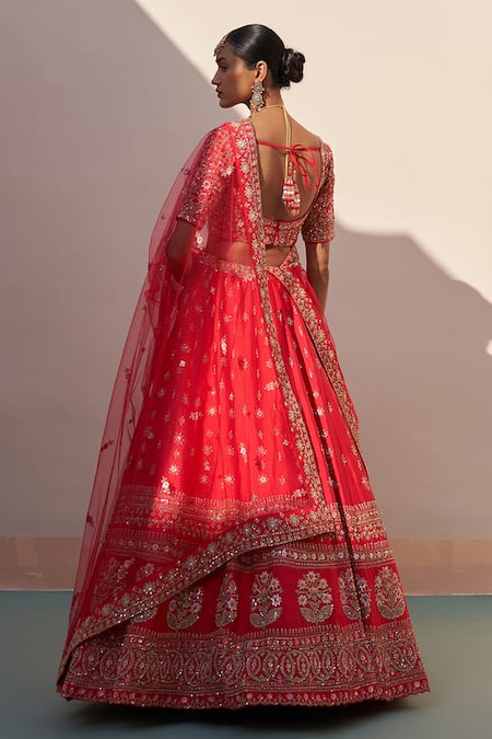 Red Silk Sequins, Zari, Cut Work Floral Embroidered Bridal Lehenga Set