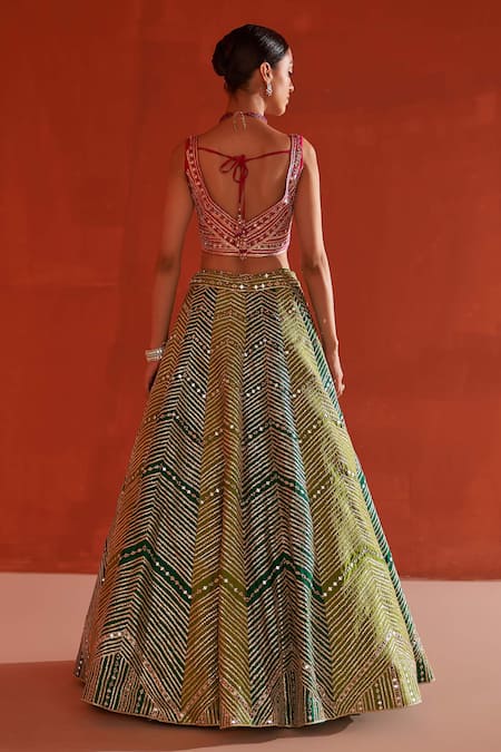 Multi color raw silk lehenga featuring an all-over chevron pattern with gota and mirror embroidery. Paired with a contrast V neck embroidered padded blouse and an embroidered dupatta.