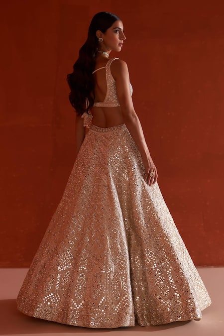 Ivory Silk, Crepe Mirrors, Embroidery Plunge Neck And Gota Bridal Lehenga Set