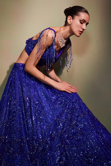 Electric blue lehenga with attached cancan, highlighted with delicate tonal sequin, crystal embroidery & drawstring at the waist. Comes with sweetheart neckline padded blouse & net dupatta.