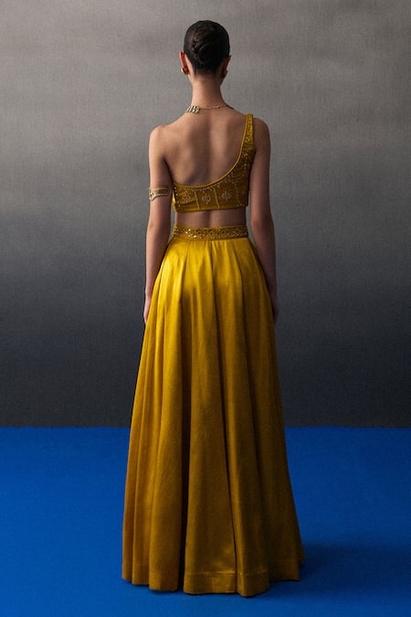 Mustard lehenga set made from satin silk featuring a flared skirt and a cropped blouse. Paired with a coordinating dupatta adorned with embellishments.