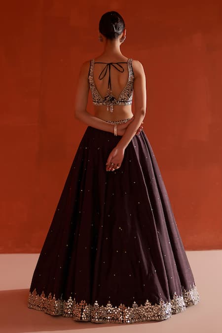 Brown Silk, Crepe, Chiffon Mirrors, Zari, Sequins And Embroidered Lehenga Set