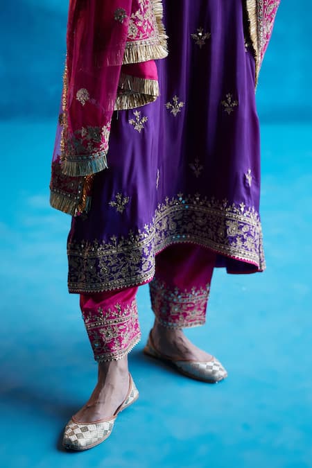 Purple kurta with kasab, tilla and sequin embroidery. Comes with rani pink salwar and net dupatta.
