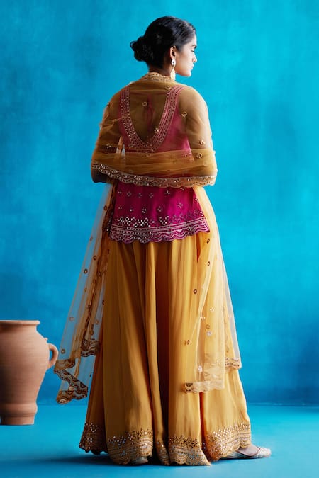 Rani pink short kurta with all-over mirror and thread embroidery. Comes with mustard sharara and net dupatta.