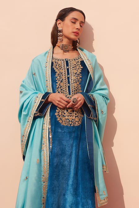 Blue Velvet, Crepe Embroidery Round Neck Choga Set