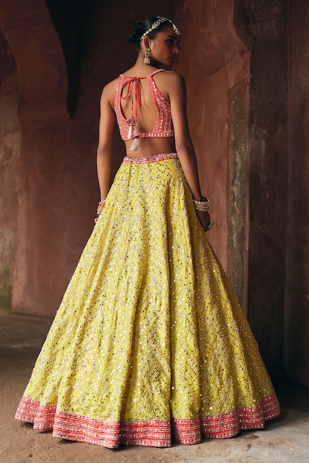 A sunlit yellow raw silk lehenga with orange borders, embroidered in chevron-style mirror and zari. It is paired with a contrasting orange padded blouse and a matching dupatta.