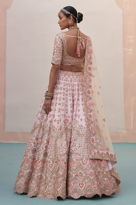 Blush pink lehenga featuring intricate zardozi, silk thread, dabka, cutdana, and sequin embroidery. Paired with a matching blouse and sheer embroidered dupatta.