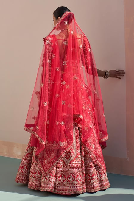Red lehenga featuring zardozi embroidery with silken threads, dabka, cutdana, and sequins. Paired with an embroidered blouse and two semi-sheer dupattas.