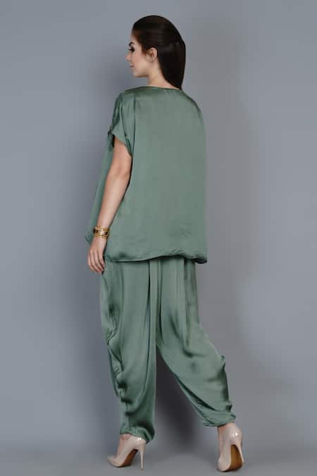 Buy_Angry Owl_Green Modal V Neck Asymmetric Top And Dhoti Pant Set _at_Aza_Fashions