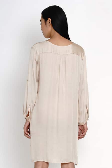 Beige high-low dress with placement owl embroidered motif & side pockets.