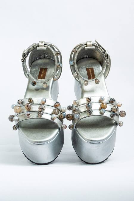 Silver platform heels featuring pearl embellished multi straps and a buckled strap closure