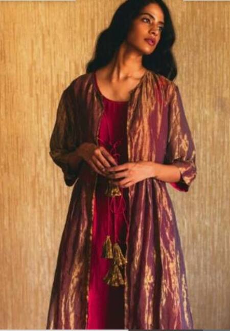 Red metallic jacket in handwoven tissue base. Paired with satin slip.