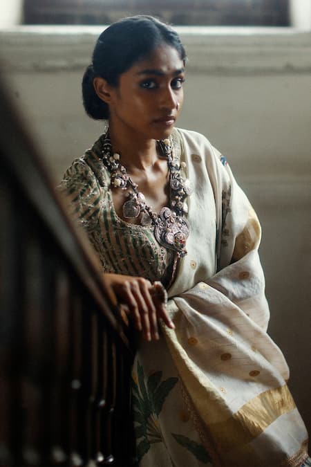 Off white handwoven zari butti silk saree with animal forest patterns, finished with zari work border. Paired with kalamkari embroidered blouse.