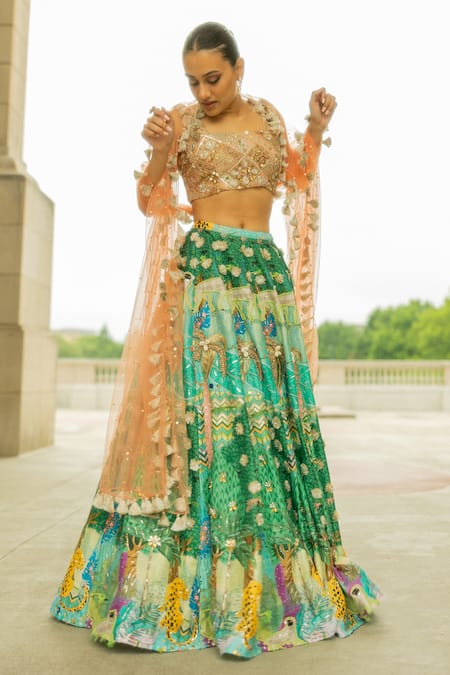 Buy_Payal Singhal_Green Net, Georgette, Dupion Animal Square Neck Print Lehenga Set _Online_at_Aza_Fashions