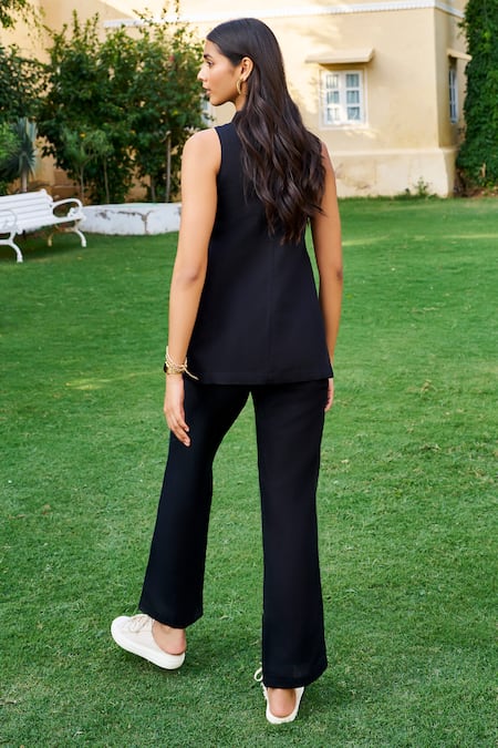 Black top featuring floral and leaf embroidery with a round neckline and sleeveless design. Paired with matching plain pants that include pockets.
