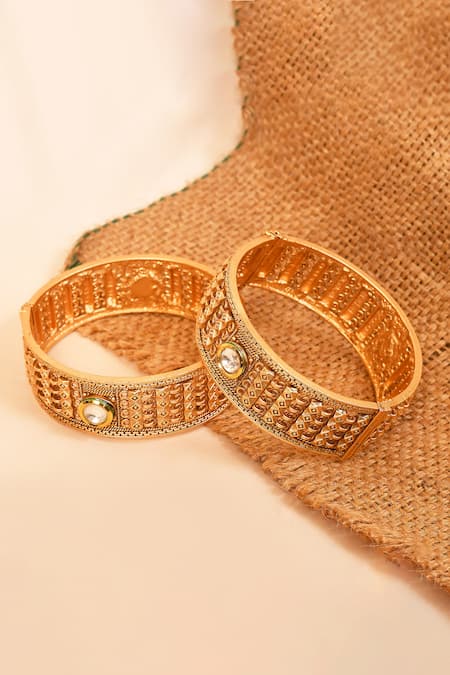 Buy_Anjali Jain_Gold Plated Stones Geometric Carved Bangles - Set Of 2