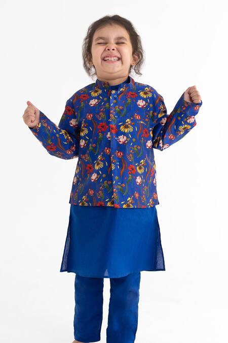 Royal blue bandhgala featuring a tota chidiya print in silk chanderi. Paired with a coordinating kurta and pant.