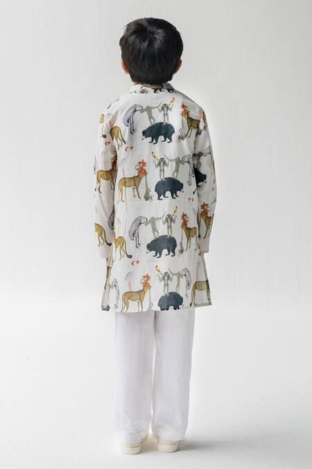 Ivory Cotton Voile Printed Animal Chidiya Ghar Ki Sair Full Sleeve Kurta Set