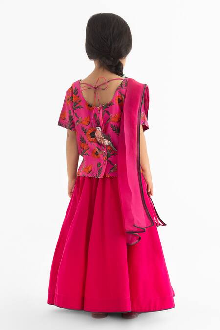 Fuchsia pink lehenga set featuring a half sleeves blouse with chidiya & tota print and beads embellishments. Paired with a plain five kali lehenga and dupatta with emerald green piping detail.