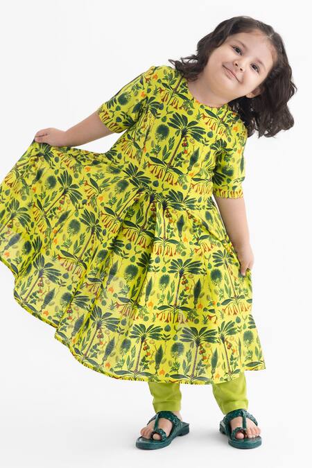 Lime green half sleeves anarkali in silk chanderi featuring jaadui jungle print and bead embellishments. Paired with a matching pyjama for a complete look.