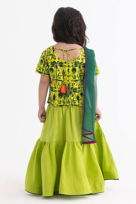 Lime green half sleeves blouse featuring an all-over jaadui jungle print with bead embellishments. Paired with a tiered lehenga and a dupatta with emerald green piping detail.