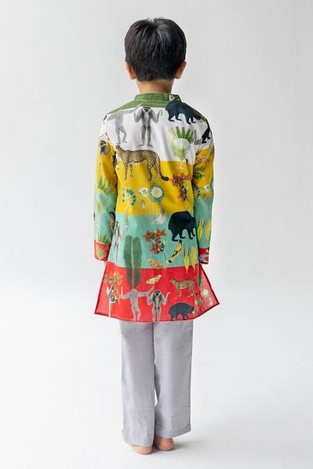 Multicolor kurta featuring jungle print, mandarin collar, and full sleeves. Paired with a matching pyjama.