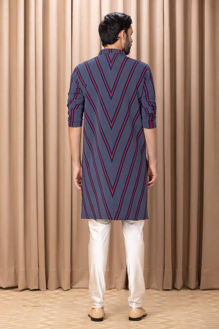 Navy blue kurta featuring digital printed hand painted chevron line patterns. Paired with an ivory churidar.